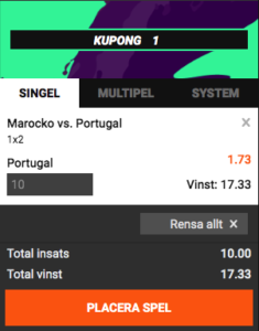 Jag väljer att spela Portugal att vinna matchen till oddset 1,73 hos Betinia. Detta gör jag med en så kallad dubbelflat. Det vill säga en dubbel insats mot en vanlig insats.