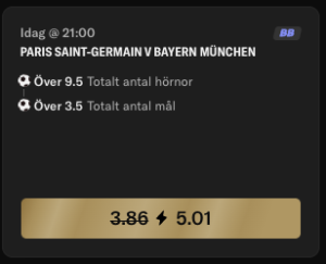Under tisdagskvällen är det åter dags för Champions League! Det är dags för den första semifinalen mellan PSG och Bayern Munchen. Ett fasansfullt tempo är att vänta mellan två lag som öst in mål under slutspelet. BetMGM boostar upp oddset på Ö3,5 mål+Ö9,5 hörnor till 5,01!