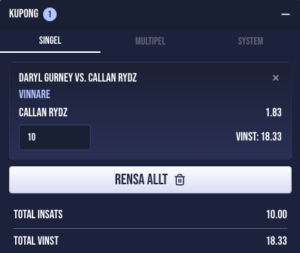Callan Rydz att vinna matchen spelas till oddset 1,83 hos Betinia